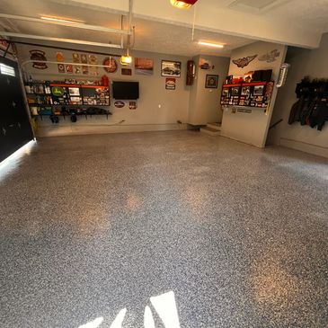 After thorough preparation we apply an epoxy base and apply a vinyl flake application, with thousands of colour variations available. The final step is a two part clear coating with grip additive applied if desired